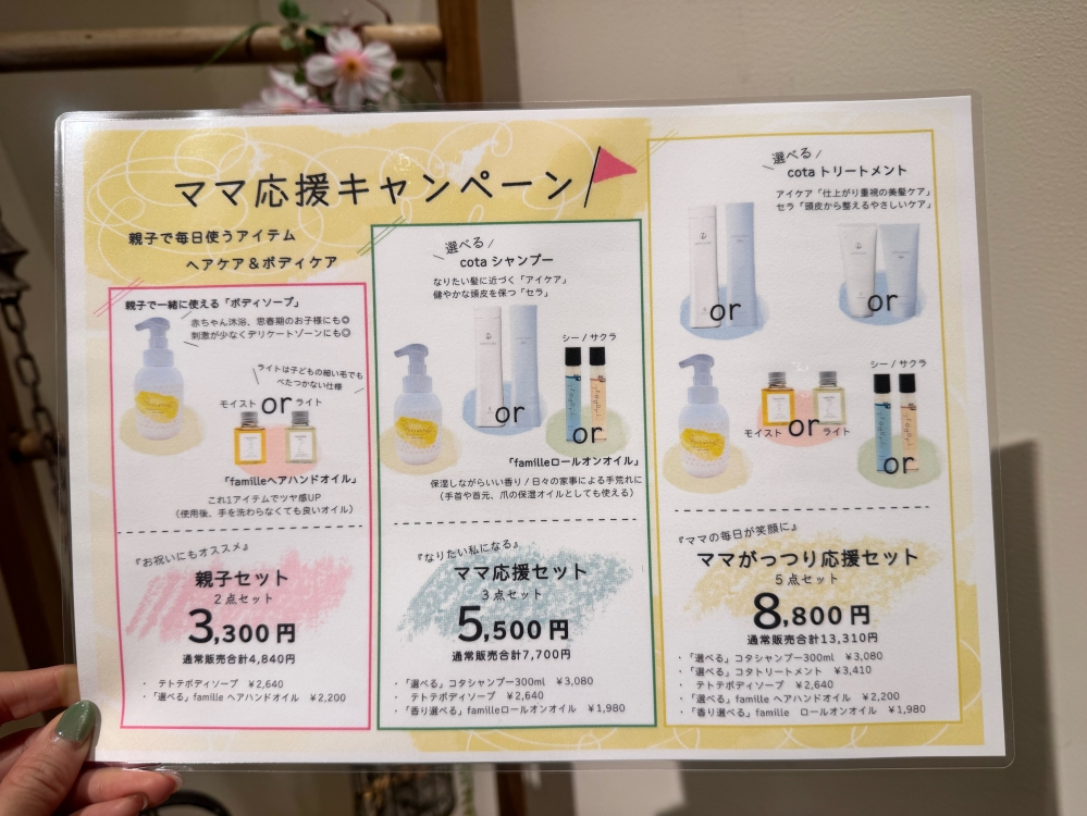 大人気のファミーユシリーズやコタのシャンプーとトリートメントをセット購入で割引させていただけます。